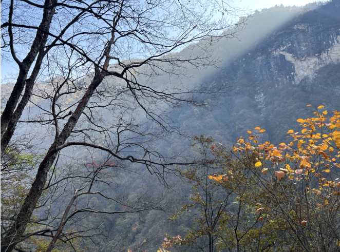 植被因常年處于濕潤的霧氣環(huán)繞之中,在秋末冬初,霧氣與紅葉相互交融,山巒的叢林被洗滌得蔥蘢翠綠、斑斕多彩,增添了一份神秘的氛圍,讓人仿佛置身于仙境之中。
