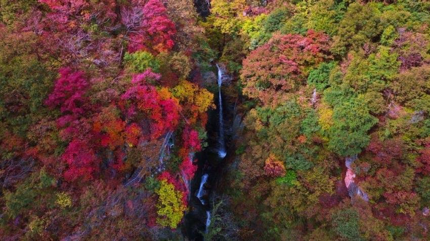園內(nèi)有眾多瀑布,如彩虹瀑布、仙鶴橋瀑布等,瀑布飛瀉而下,激起層層水霧,在紅葉的映襯下更顯靈動(dòng)。從空中俯瞰,瀑布猶如銀針貫穿于萬(wàn)木之中,與周圍的山巒、樹木共同構(gòu)成了山水相依的自然景觀。