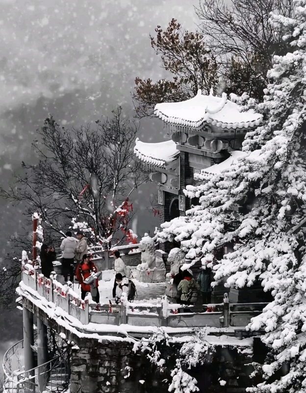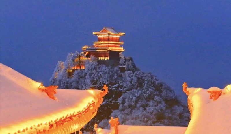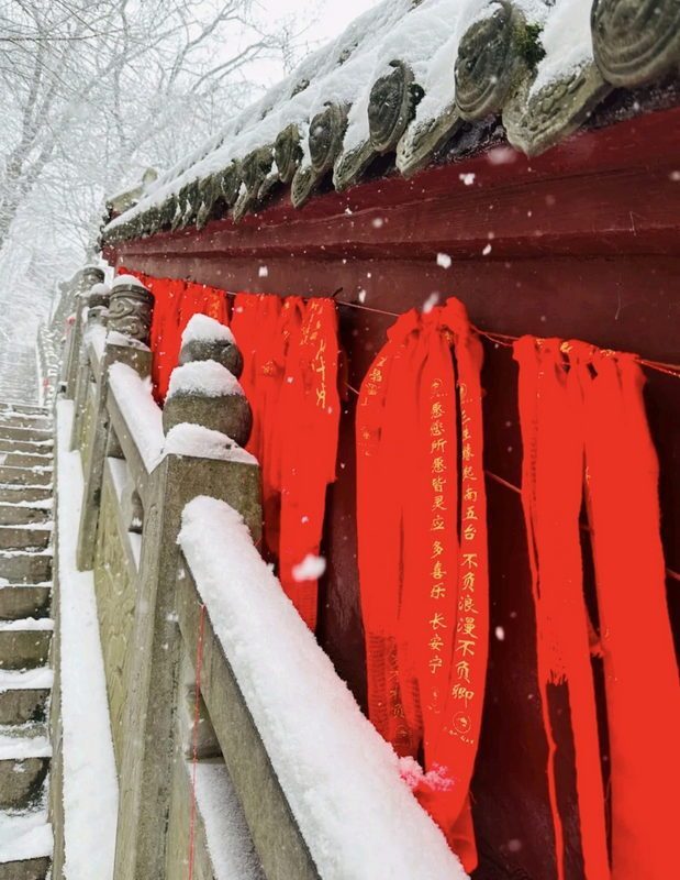 瑤臺(tái)仙境的煙火氣息,當(dāng)夜幕降臨燈光亮起,南五臺(tái)又呈現(xiàn)出另一番迷人的景象:飛檐斗拱被勾勒出清晰的輪廓,暖黃色的燈光映照在雪地上,為這清冷的冬夜增添了幾分溫暖。