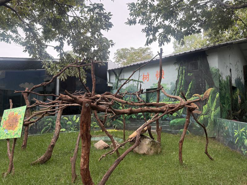 為迎接新成員的到來(lái),園區(qū)為樹(shù)懶們新建了一處原生態(tài)的家園,設(shè)置樹(shù)屋并將仿真樹(shù)枝貫穿其中,供它們棲息。工作人員說(shuō),這樣的設(shè)計(jì)能滿足樹(shù)懶棲居樹(shù)上,愛(ài)用爪鉤住樹(shù)枝倒掛身軀或在樹(shù)上移行的特性。樹(shù)懶館門口,掛著一幅工作人員手繪的微笑樹(shù)懶漫畫(huà),十分溫馨。樹(shù)屋里,隨處可見(jiàn)熱帶雨林的布置,對(duì)溫度、濕度有著嚴(yán)格的控制。