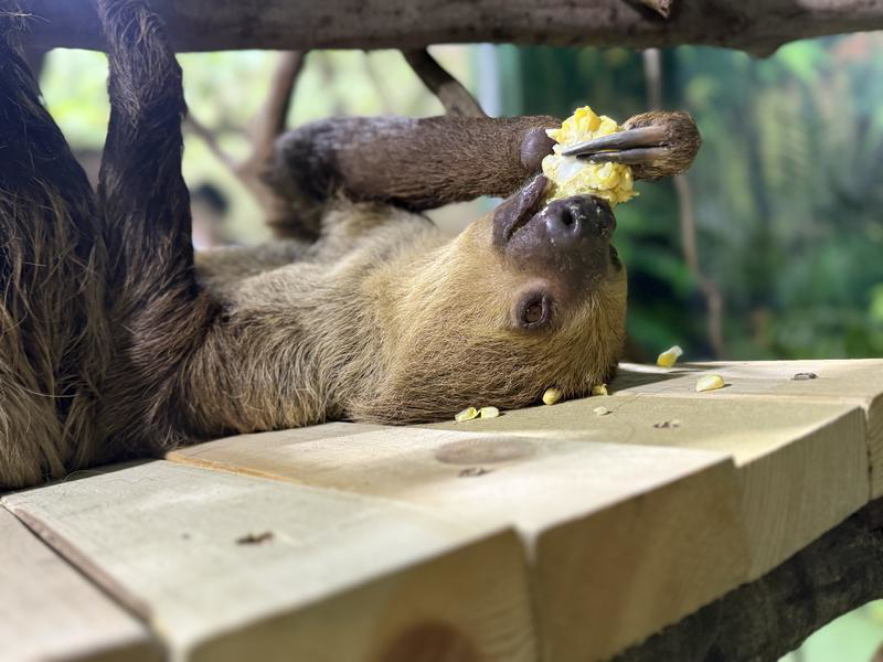 樹(shù)懶們倒掛在樹(shù)上,懶洋洋吃著玉米,發(fā)出脆脆的聲音,其中一只叫“忽忽”的樹(shù)懶是一個(gè)女孩。飼養(yǎng)員劉澤銳說(shuō),取這個(gè)名字是因?yàn)樗鈺r(shí)好時(shí)壞,平時(shí)比較愛(ài)生氣,然后人摸它的時(shí)候會(huì)發(fā)出呼呼的聲音嚇唬人。“但是給它喂食的時(shí)候就表現(xiàn)得很開(kāi)心很積極,它吃得最好,胡蘿卜、黃瓜、南瓜、菜葉子等都不挑,活動(dòng)量也很大,比較淘氣一點(diǎn),到處探索,今天早上跑到花盆里面去了?!眲射J說(shuō)。