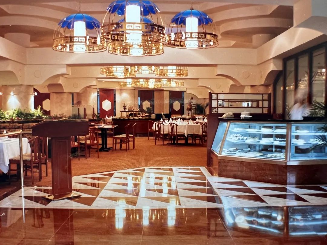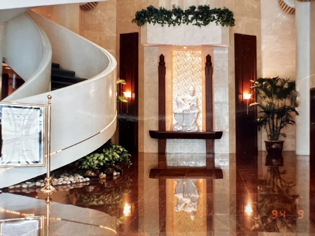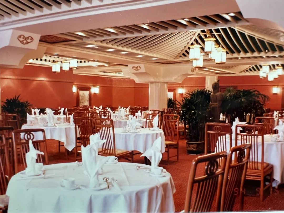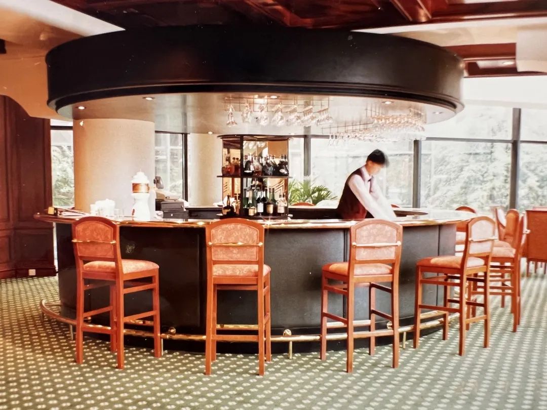 照片由上至下分別是1994年金花大酒店的大堂、旋轉(zhuǎn)樓梯、中餐廳、西餐廳、大堂吧