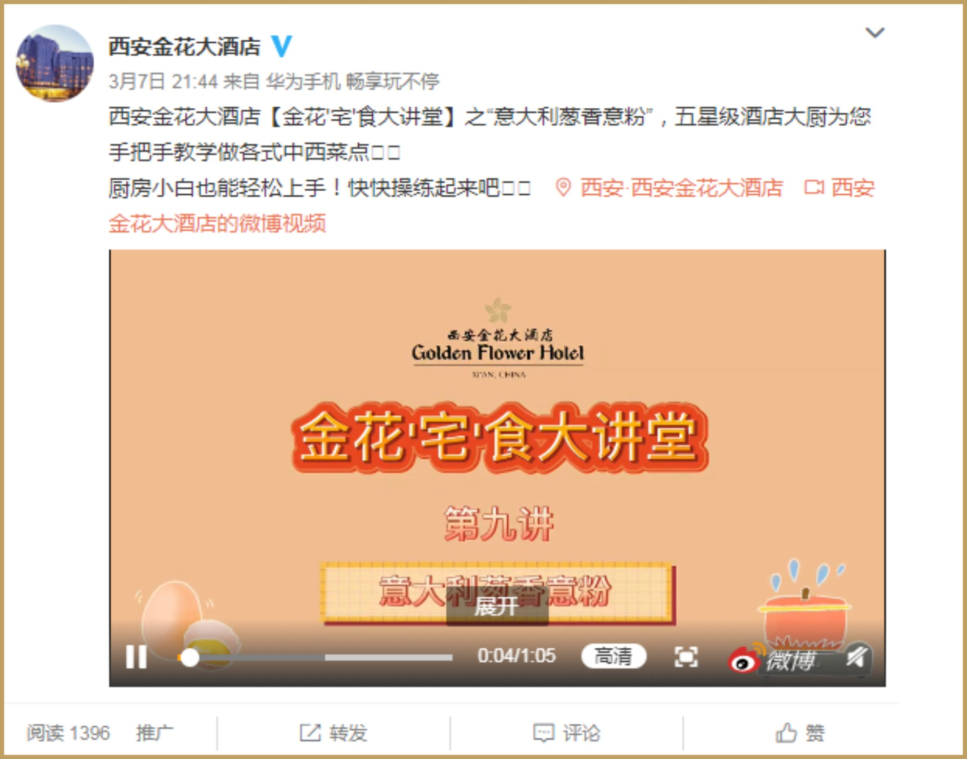 一個多月以來,酒店以抖音、企業(yè)微博、小紅書、專屬微信粉絲群等新媒介為宣傳載體,先后發(fā)布12篇中西美食教程,受到了美食達人、網(wǎng)紅以及微信粉絲的熱議和追捧。